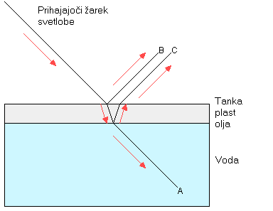 Na tej sliki vpadni žarek prihaja od zgornje leve strani. Prvi del žarka (svetlobe) prodre skozi film in potuje naprej po vodi oziroma katerikoli drugi tekočini na kateri plava olje (A). Drugi del pa se je odbije od zgornje plasti filma (B). Tretji del pa se je odbije od spodnje plasti filma (C).